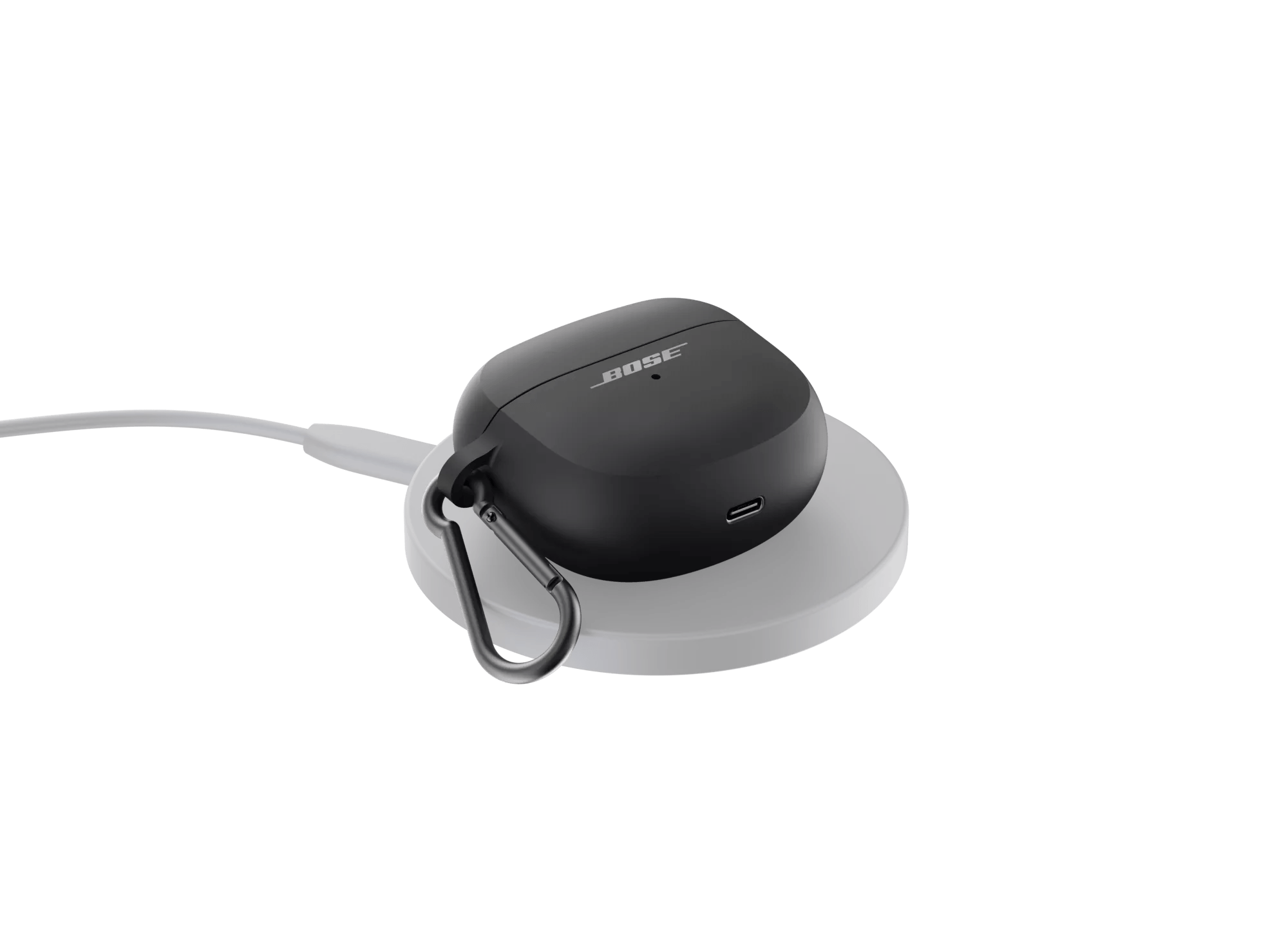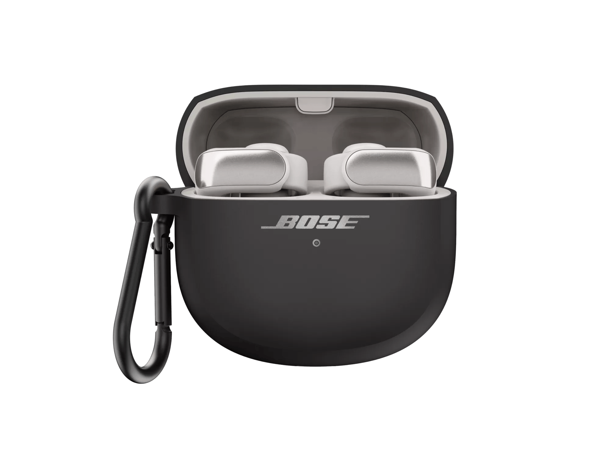 Power up wirelessly with the Bose Ultra Open Earbuds Wireless Charging Case Cover. Soft-touch silicone defends against scratches and scuffs. An aluminum carabiner clips to your bag or belt loop, so you can keep your earbuds close by. And the convenience of it all puts you in charge.