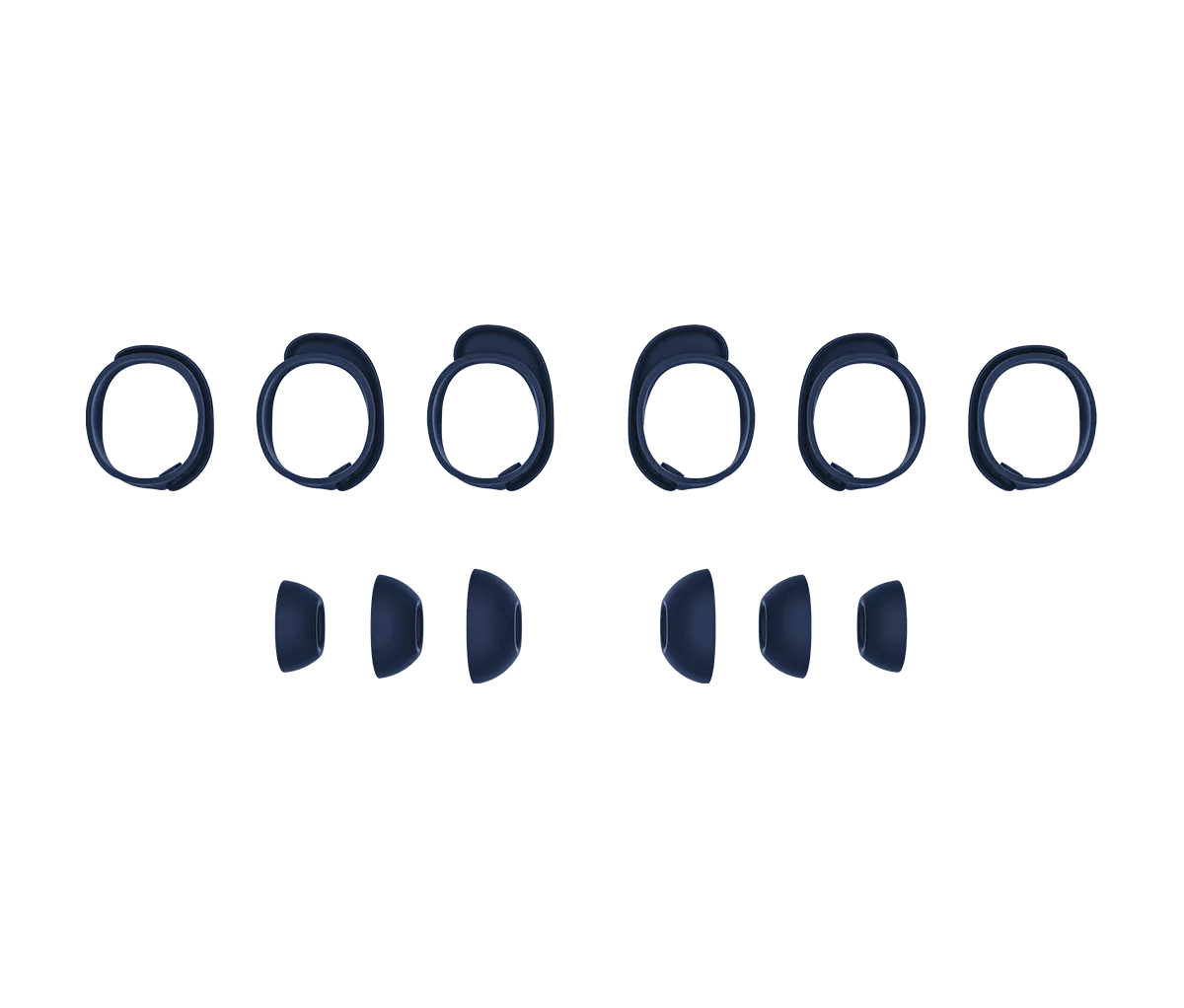 The Bose QC Earbuds II Fit Kit contains silicone eartips and stability bands to replace the originals in the event that you need new ones. The Bose QC Earbuds II Fit Kit includes 3 different pairs of soft eartips (S, M, L) and 3 different pairs of stability bands (1, 2, 3) to mix and match to find your best fit.The eartips rest gently but securely in your ears and spread contact evenly, creating a comfortable seal that is important to delivering the best audio performance and the most powerful noise cancellation. The stability bands hug the contours of the outer parts of your ear, ensuring that the earbuds stay in place.